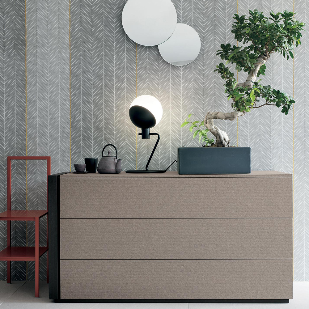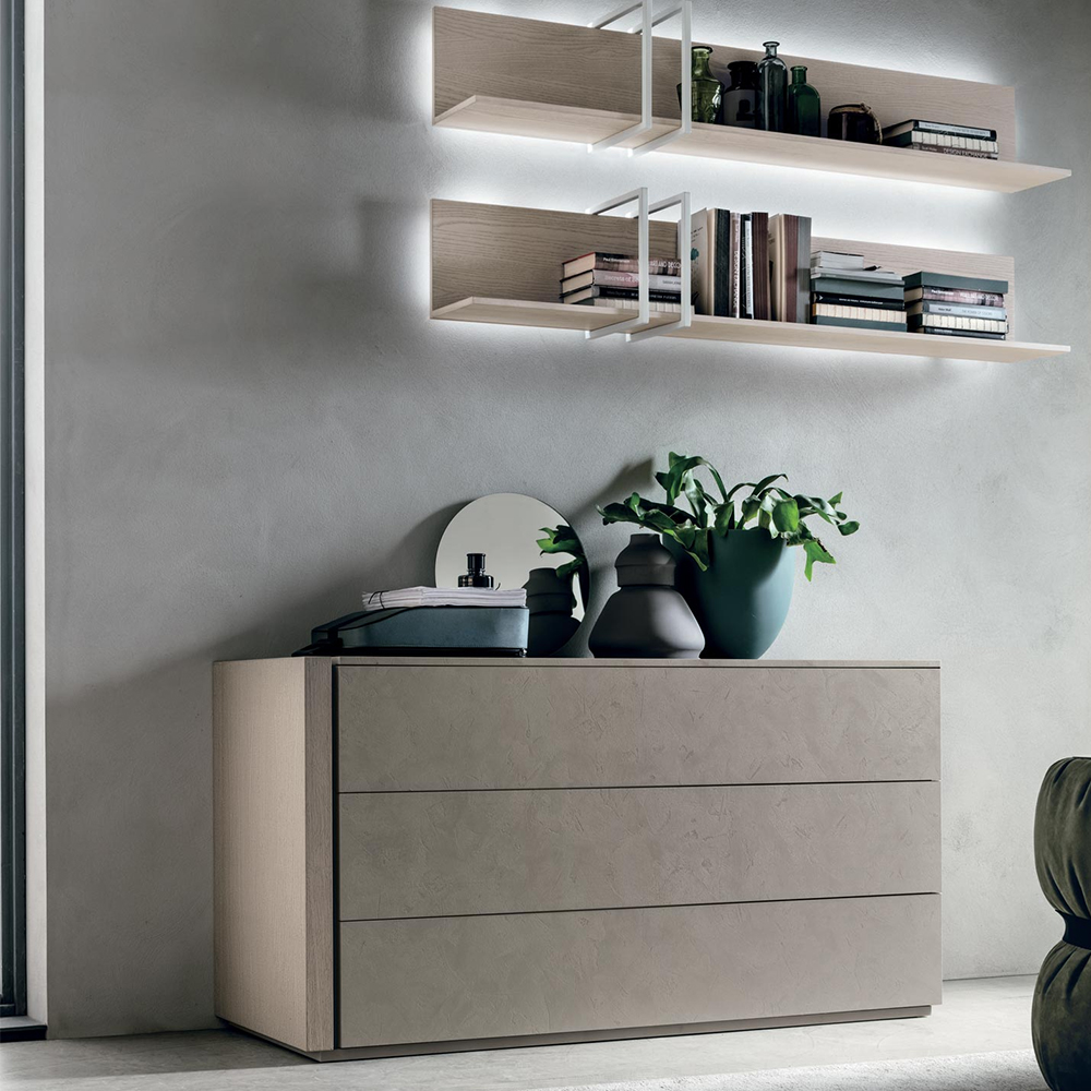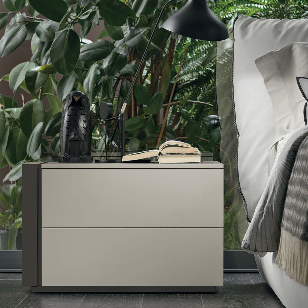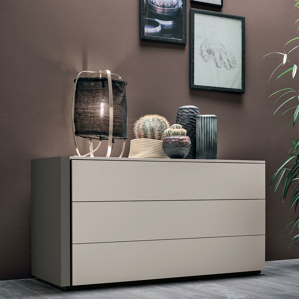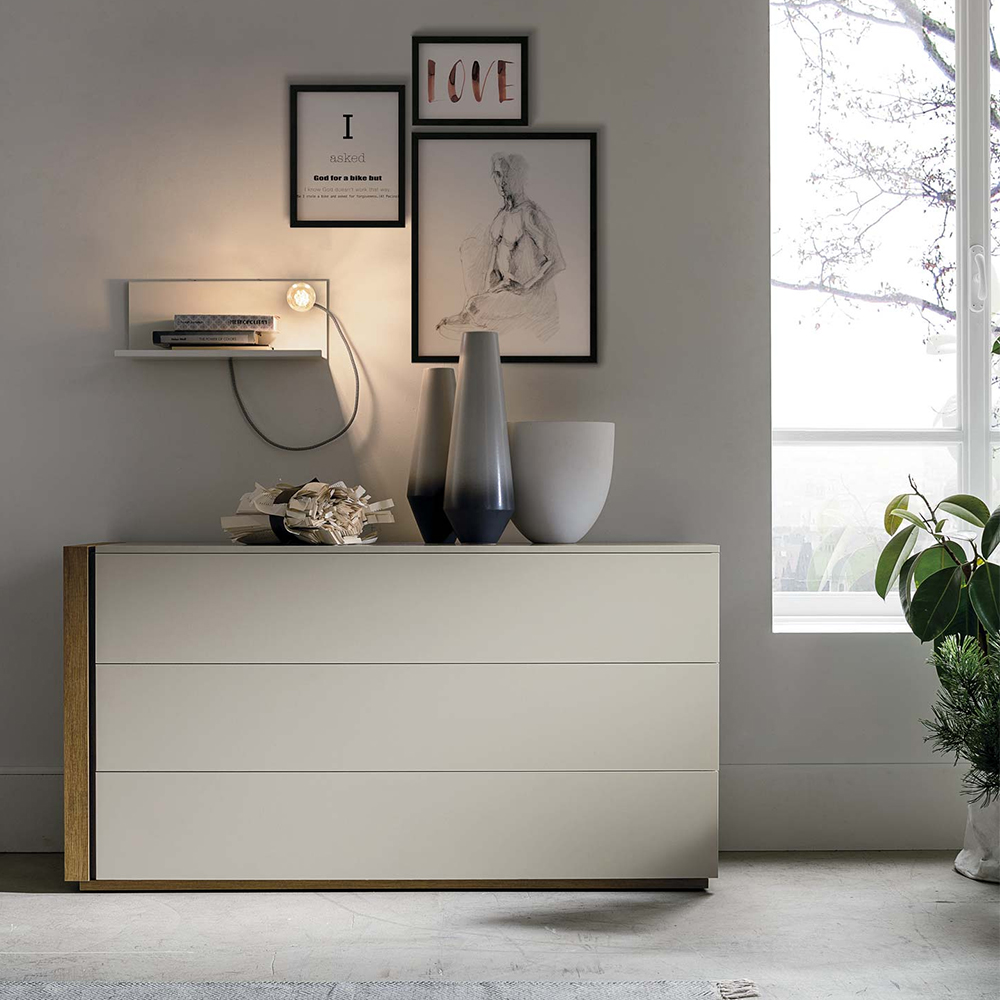 И в комоде с тремя ящиками, и в тумбочках минималистического дизайна обращает на себя внимание одна особенность: гладкие поверхности без ручек сочетаются с боковиной контрастной расцветки. Интерьер ночной зоны обретает оригинальность.