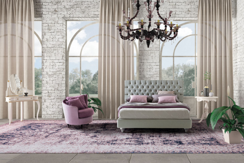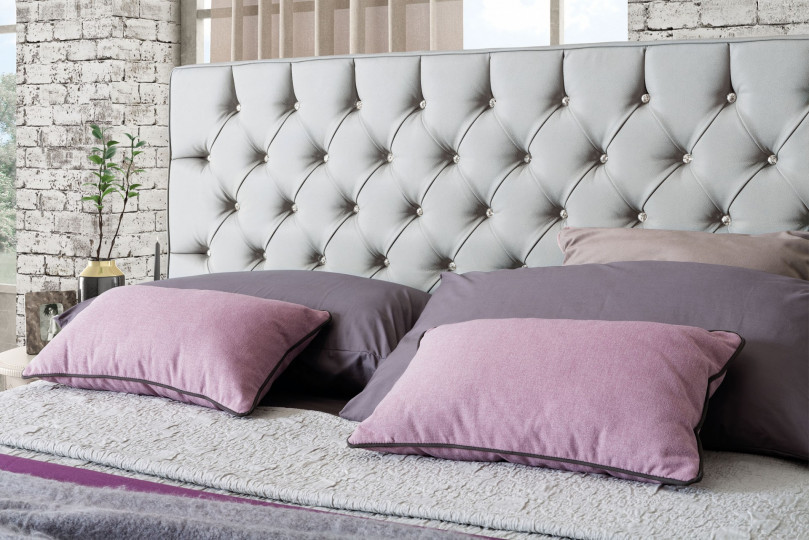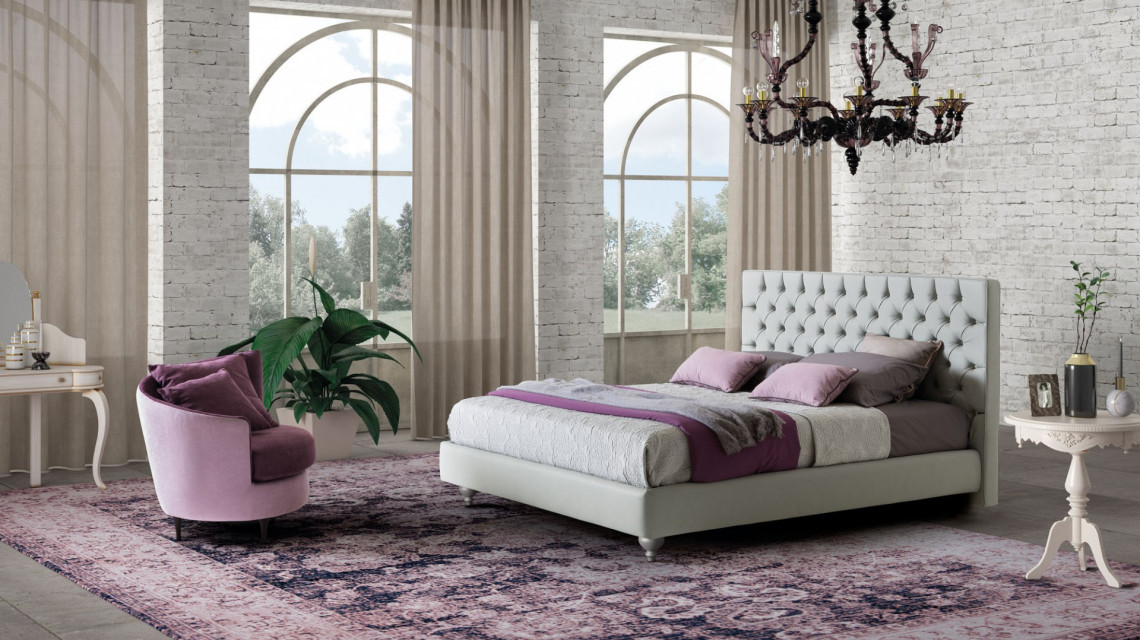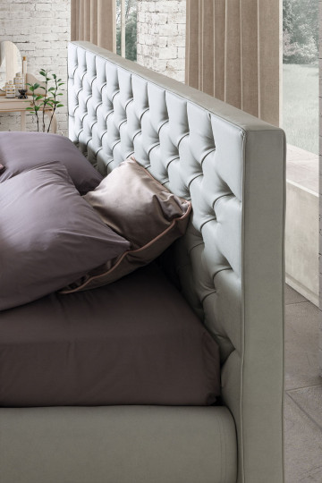 Тканевые пуговицы бросают вызов элегантным орнаментальным кристаллам, создавая мягкую игру объемов, которая оживляет эффектную капитоне квадратного изголовья. Инновационная трехмерная перспектива создается благодаря мягкой прострочке, создающей световые эффекты на нижней платформе. Последняя великолепно поддерживается высокими ножками круглого сечения.