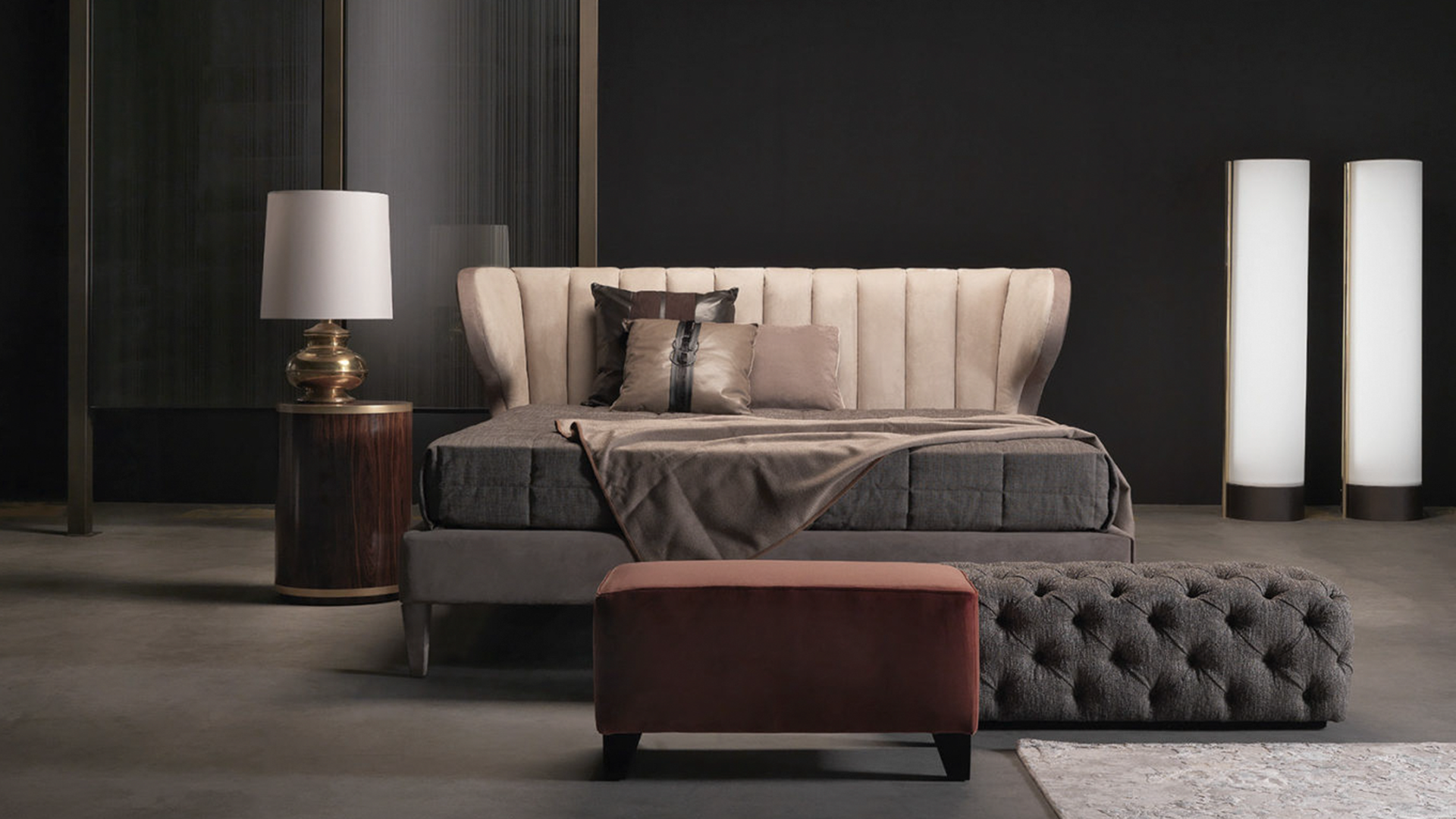 Структура из бука и пены. Обивка из кожи. Ноги с отделкой из бронзированной латуни.