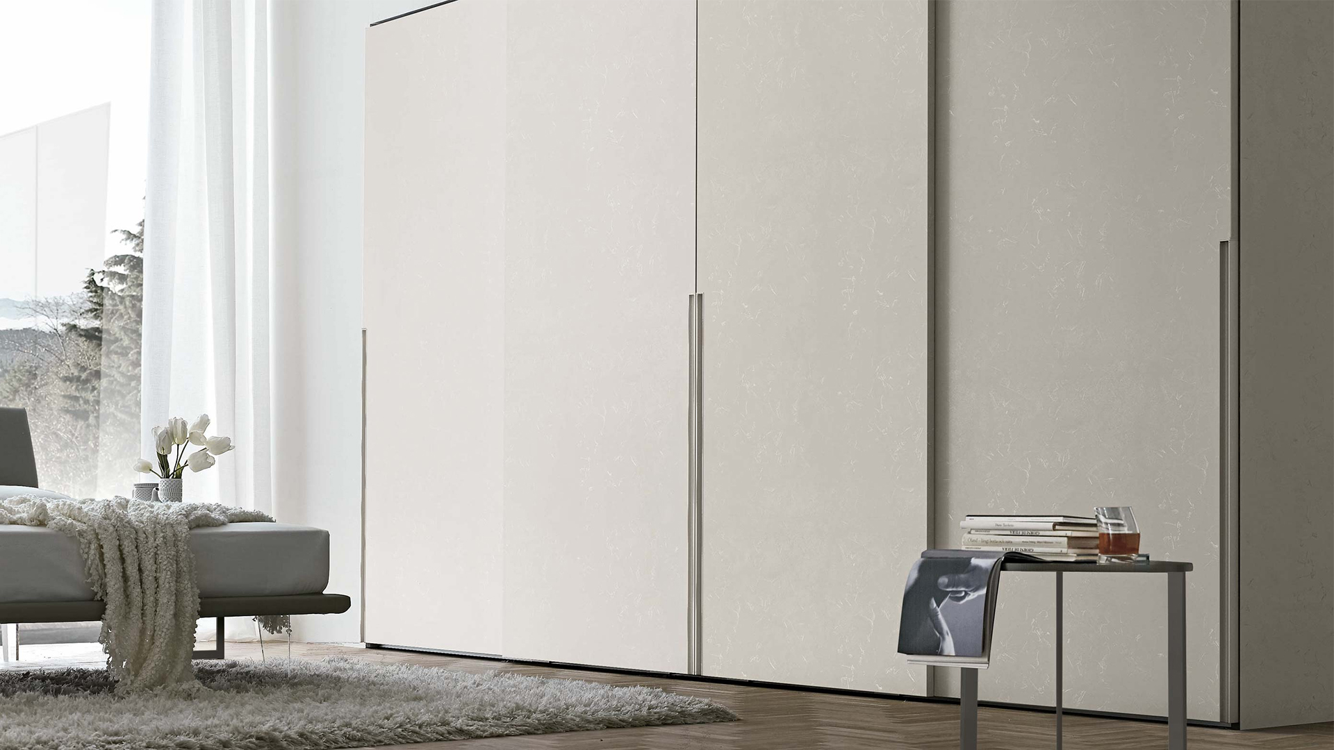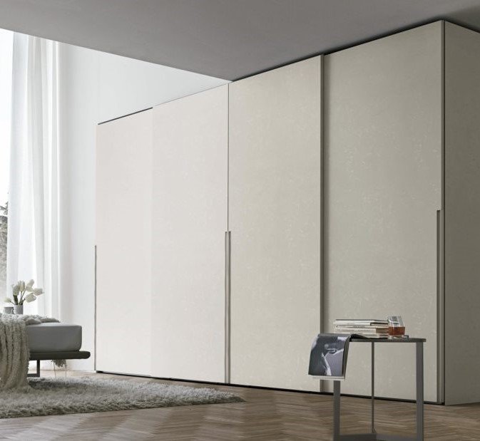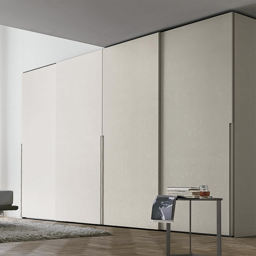 Встроенная в створку металлическая ручка делит высоту шкафа на две части. Она выполняет не только декоративные функции, но и отличается большой практичностью, обеспечивая удобный захват для открытия Doris. В качестве дополнительной опции встроенная ручка предлагается в варианте с подсветкой.